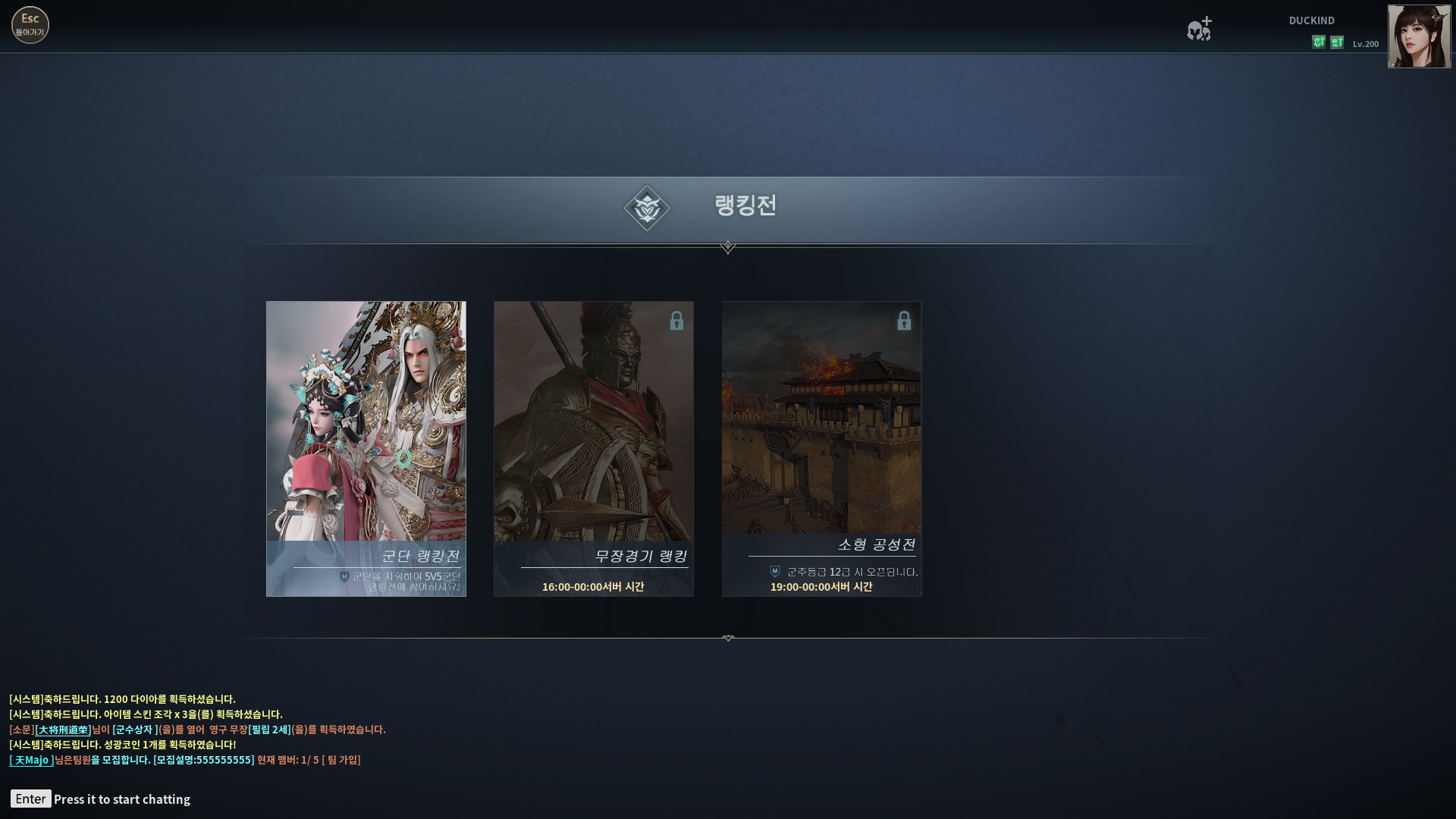 랭킹전의 경우 군단 랭킹전만 있었는데